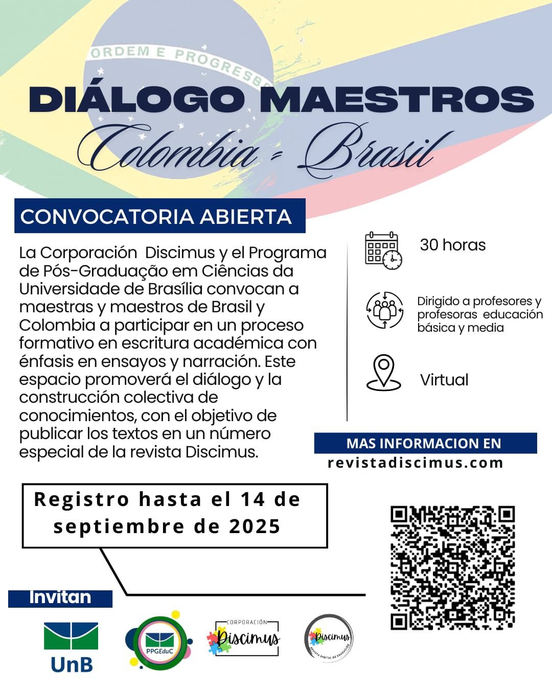 La Corporación Discimus, Centro Miembro Pleno de CLACSO, y el Programa de Pós-Graduação em Ciências da Universidade de Brasília (UnB) convocan a maestras, maestros, profesoras, profesores, educadores populares y líderes sociales de Brasil y Colombia a participar en el Diálogo Maestros Colombia–Brasil, un espacio virtual de formación e intercambio académico.